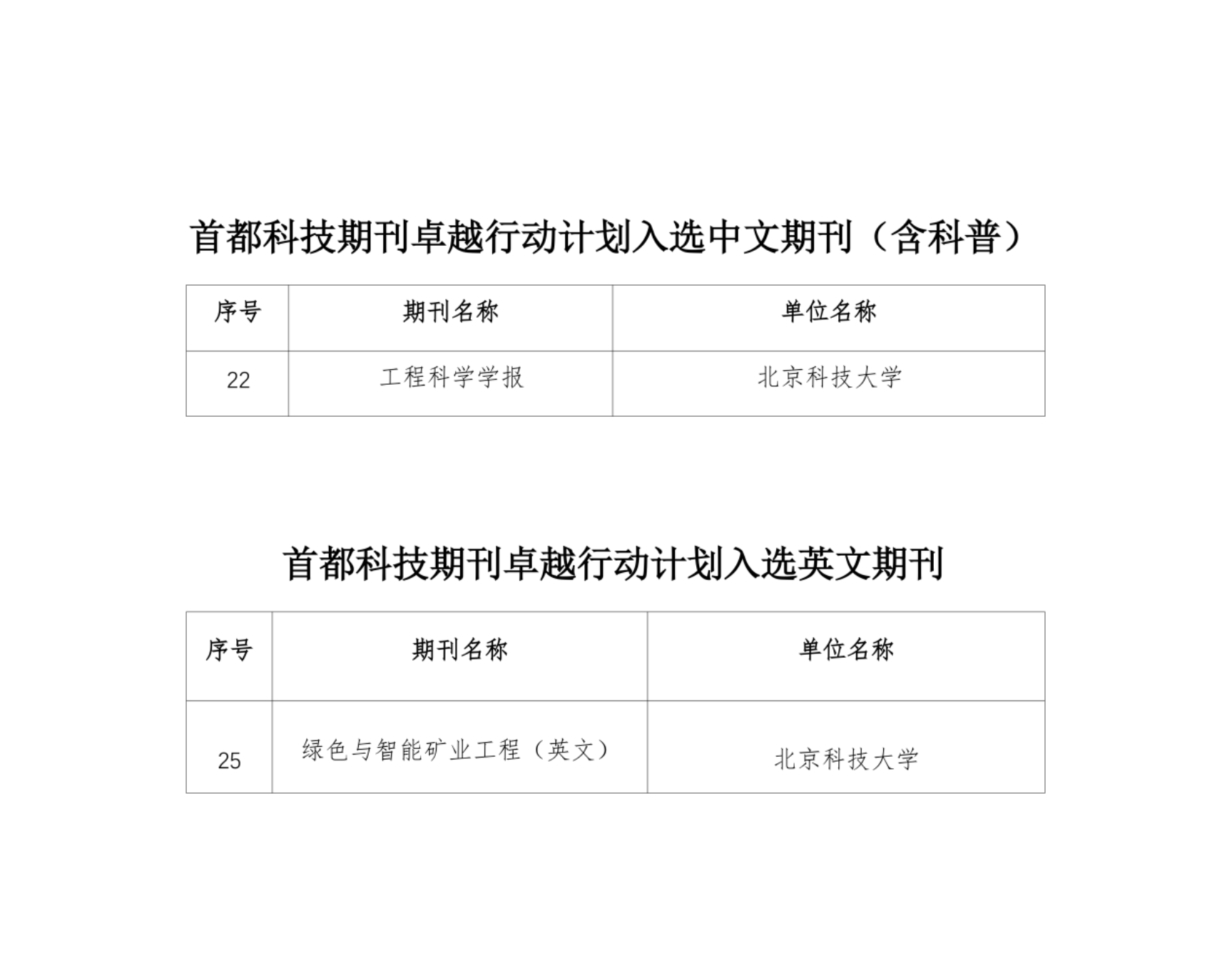 近日,北京市科学技术协会发布了《关于2025年度首都科技期刊卓越行动计划中英文单刊拟入选名单的公示》通知,北京科技大学主办的《工程科学学报》和《绿色与智能矿业工程(英文)》成功入选2025年度首都科技期刊卓越行动计划中英文单刊项目。